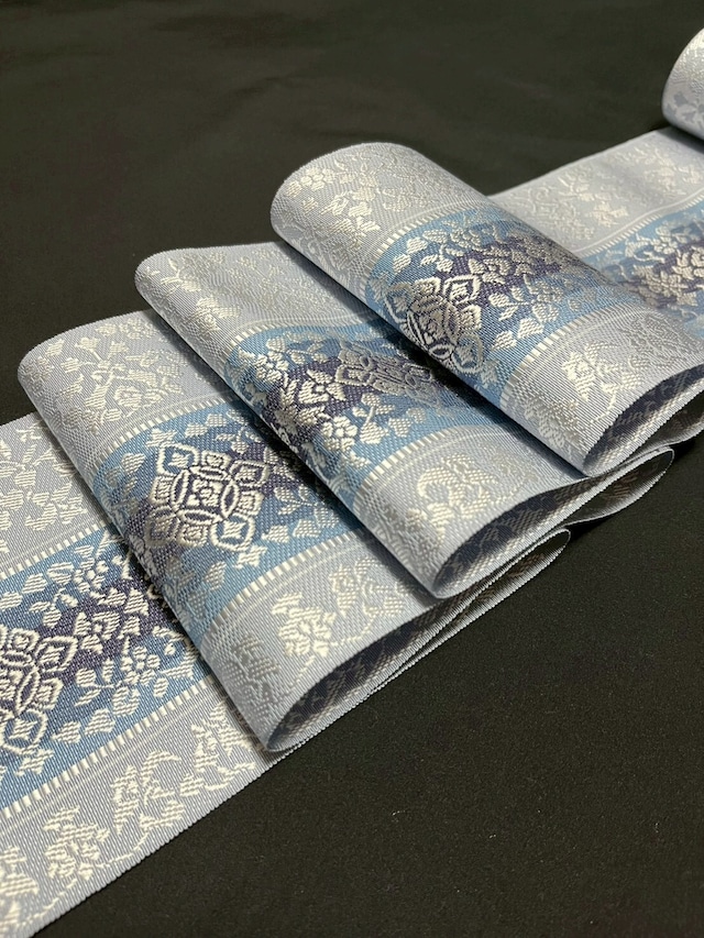 【組紐の技術で蘇る、正倉院の美】 ざっくりとした手触りで、糸がナナメに組み合う不思議な生地目の八寸名古屋帯。 正倉院に見られる「羅」の生地目を、組紐の技術と日本に2台しかない特殊な機械を用いて再現した、西陣織 三代目・博鳳 謹製『三軸組織(さんじく くみおり)』の逸品です。 青紫と白と少しの銀糸が雨のように行き交うグラデーションと、両脇の透かし柄が大変に美しく、暑い日が増えた昨今において、幅広いシーンで爽やかに楽しめるデザインとなっています。 柄付は全通柄となっており、どこを出しても柄を楽しめる使いやすいデザインです。 ※当品は反物での販売となっております。 お仕立てを希望の方はご連絡ください5千円で承ります。