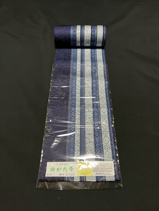 博多帯 半巾 森博多 4.3寸単変浮 ゆかた帯 ネイビー 縞