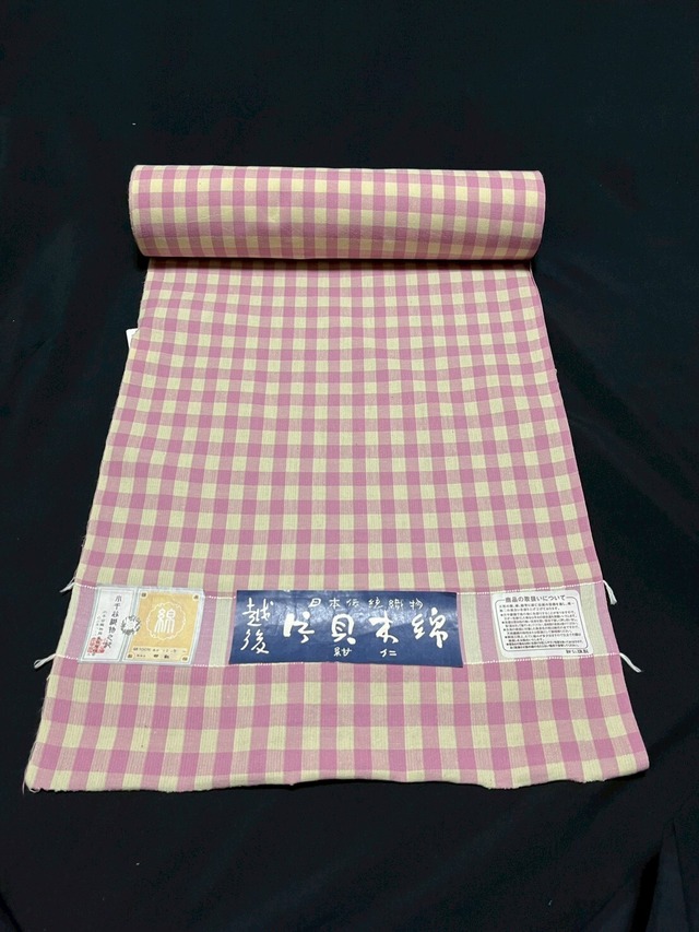 【反物】片貝木綿 紺仁 チェック ホワイト ピンク グリーン