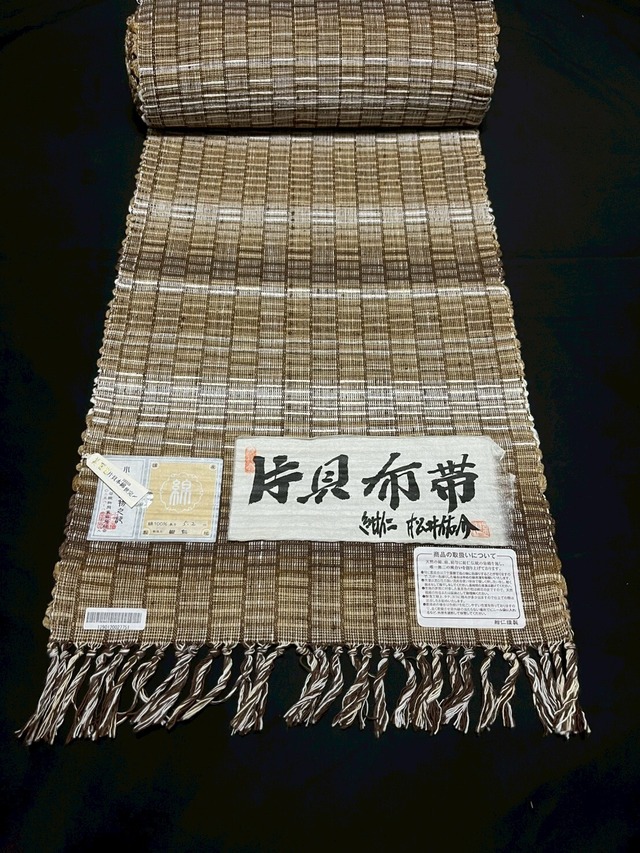 【首里花織の半幅帯】 特徴的なざっくりとした手触り、太い木綿の緯糸をしっかりと打ち込んだ美しい首里花織の半幅帯。 グレー×ベージュベースのグラデーション 使い勝手は申し分無し 砂岩層に見立てて博物館コーデなどいかがでしょうか 【寸法】 長さ…約3.88m(証紙除いた長さ…3.75cm前後) 巾…約16cm