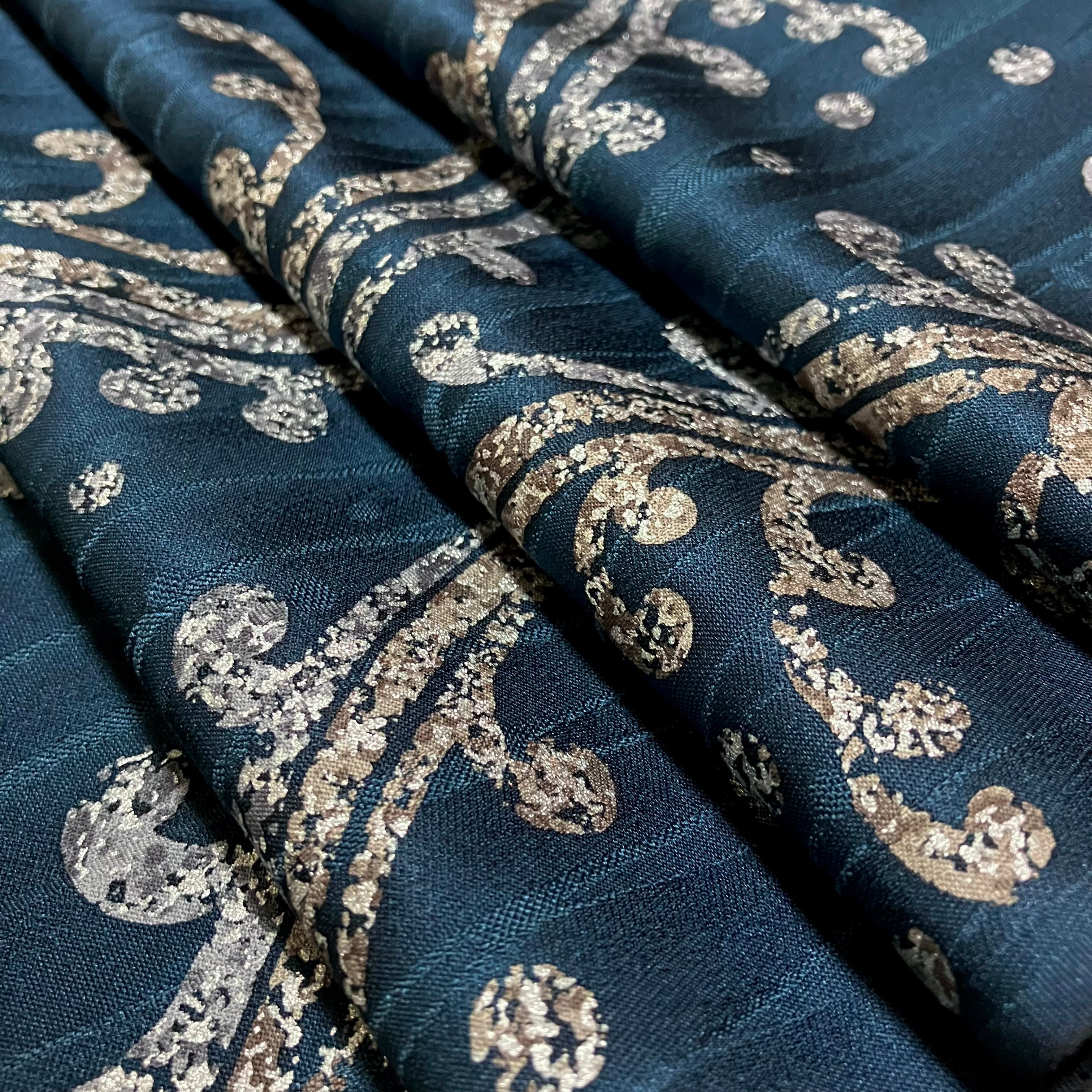 滑りの良い手触りで、水飛沫を上げながら流れる川の流れような光沢のある地柄を織り込んだ良質な紋意匠の生地に、暗い納戸色地染の上に立涌と波飛沫の柄を焦茶濃淡、チャコールグレー濃淡に銀彩を散らして重ね染して仕上げた品。