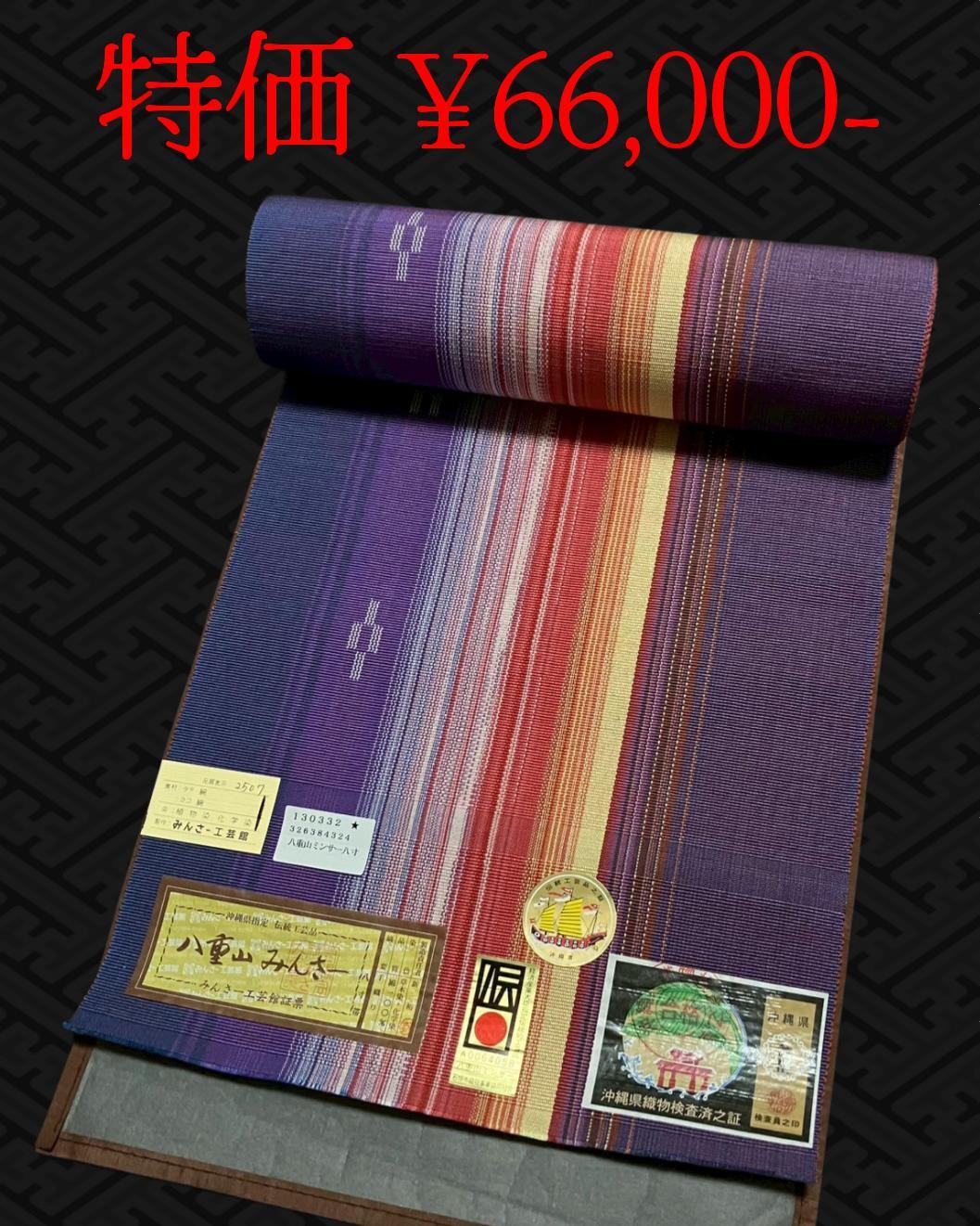 赤紫にミンサー特有の絣柄やボカシ柄を紅色や薄い黄色などに白や藍をわずかに加えて織り上げており、沖縄の海に沈む夕日のような美しさがあります。