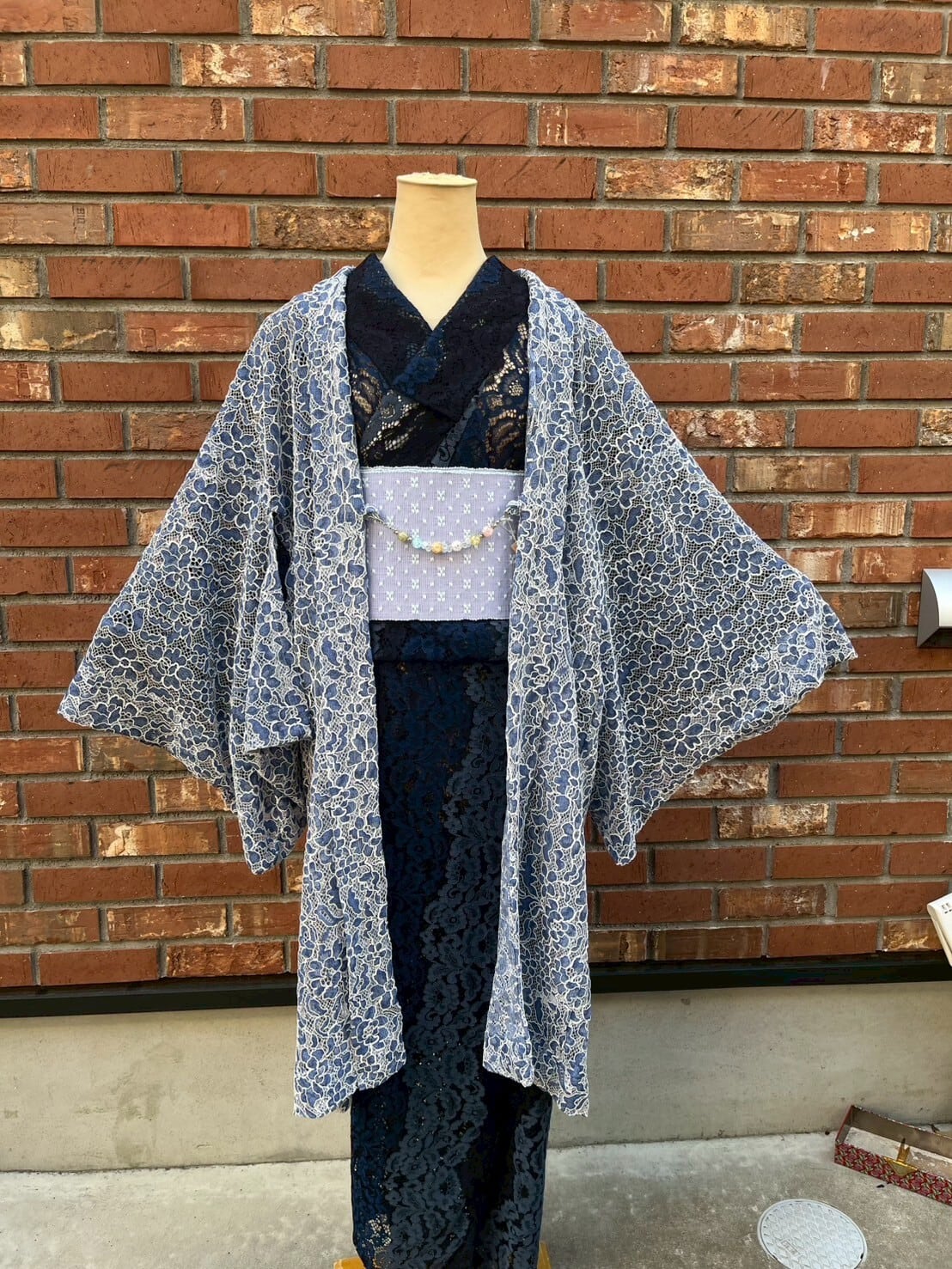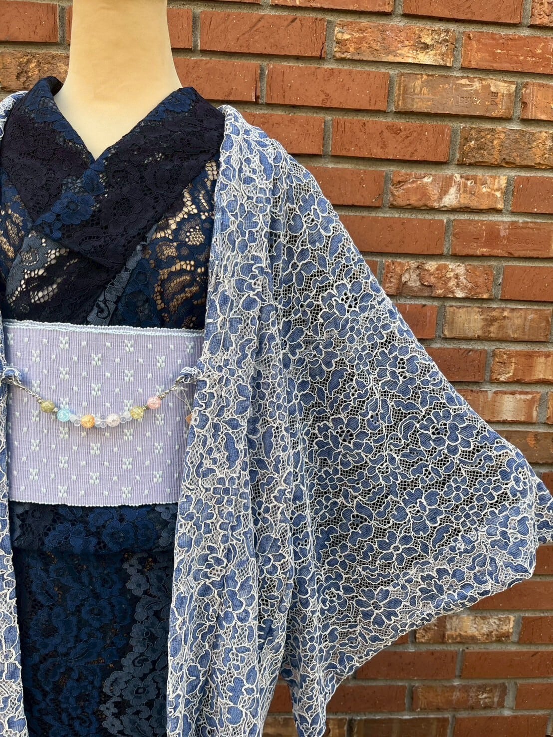 青白磁を思わせる青×薄青×白のレース羽織