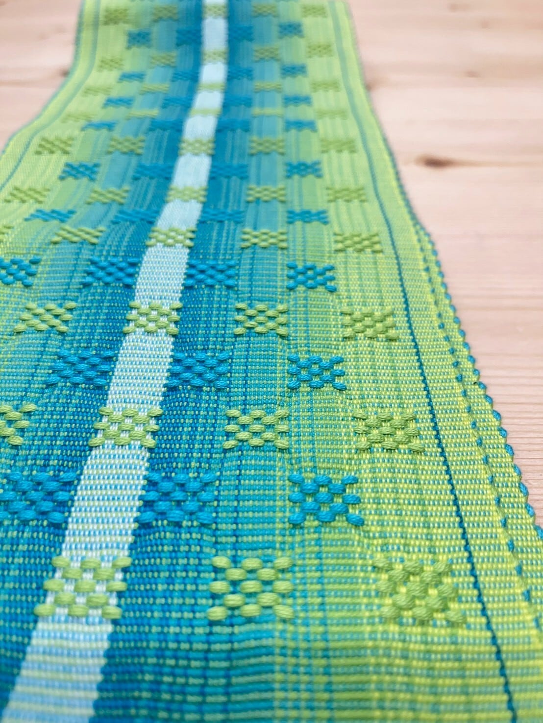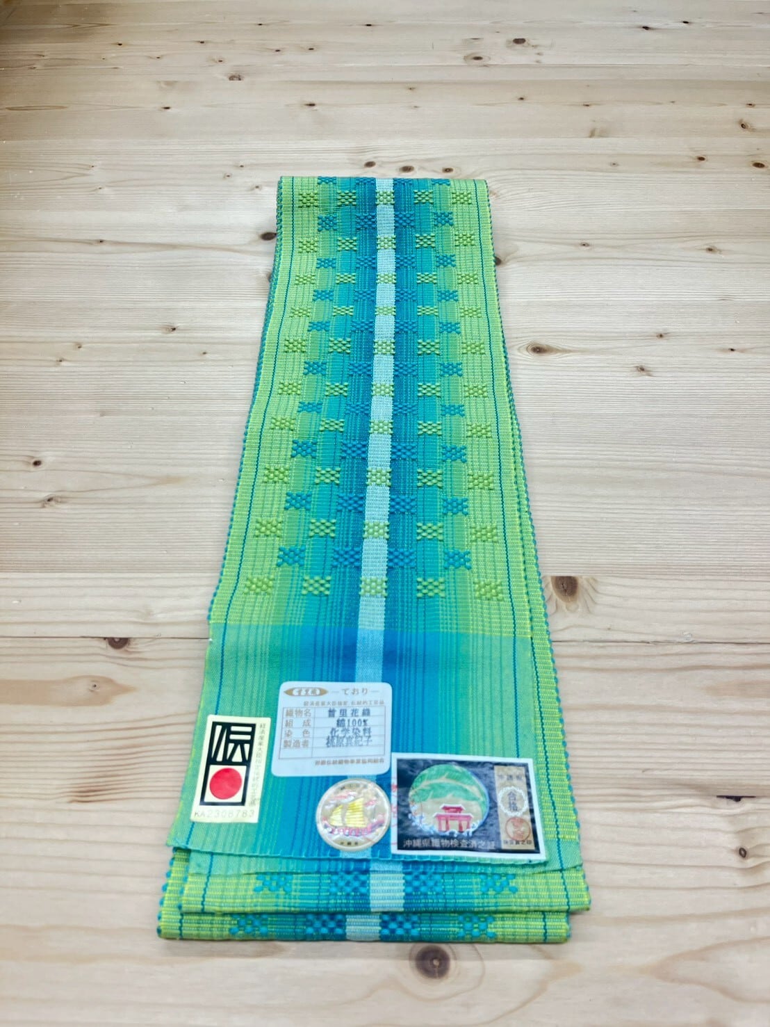 特徴的なざっくりとした手触り、太い木綿の緯糸をしっかりと打ち込んだ美しい首里花織の半幅帯。