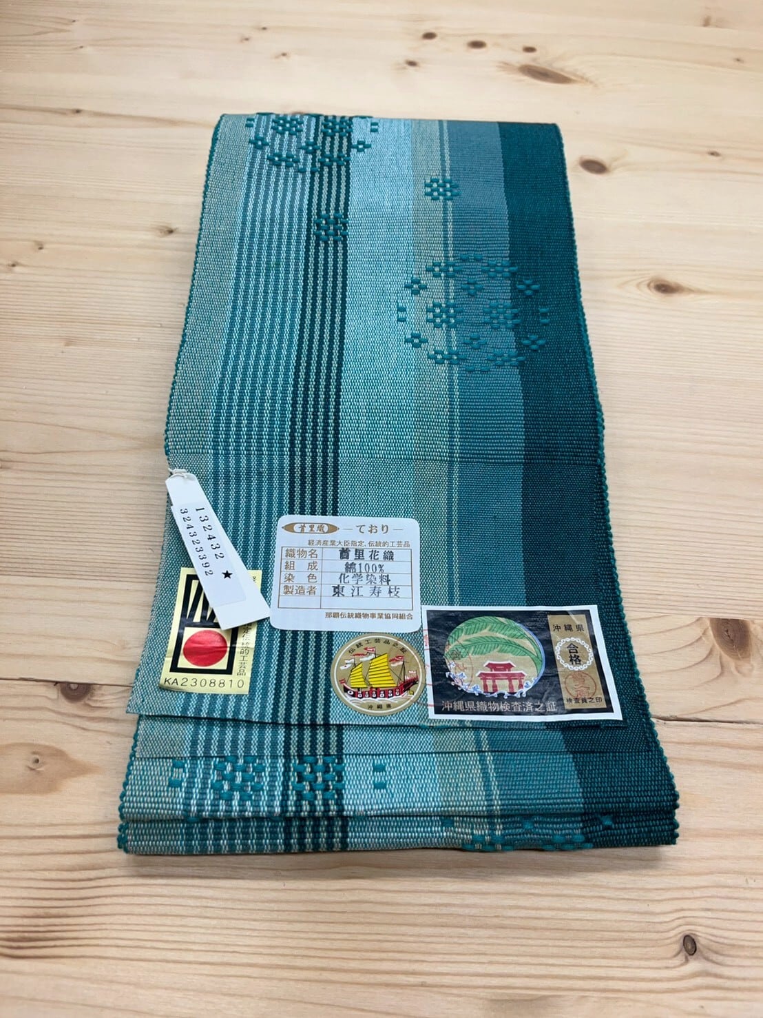 特徴的なざっくりとした手触り、太い木綿の緯糸をしっかりと打ち込んだ美しい首里花織の半幅帯。