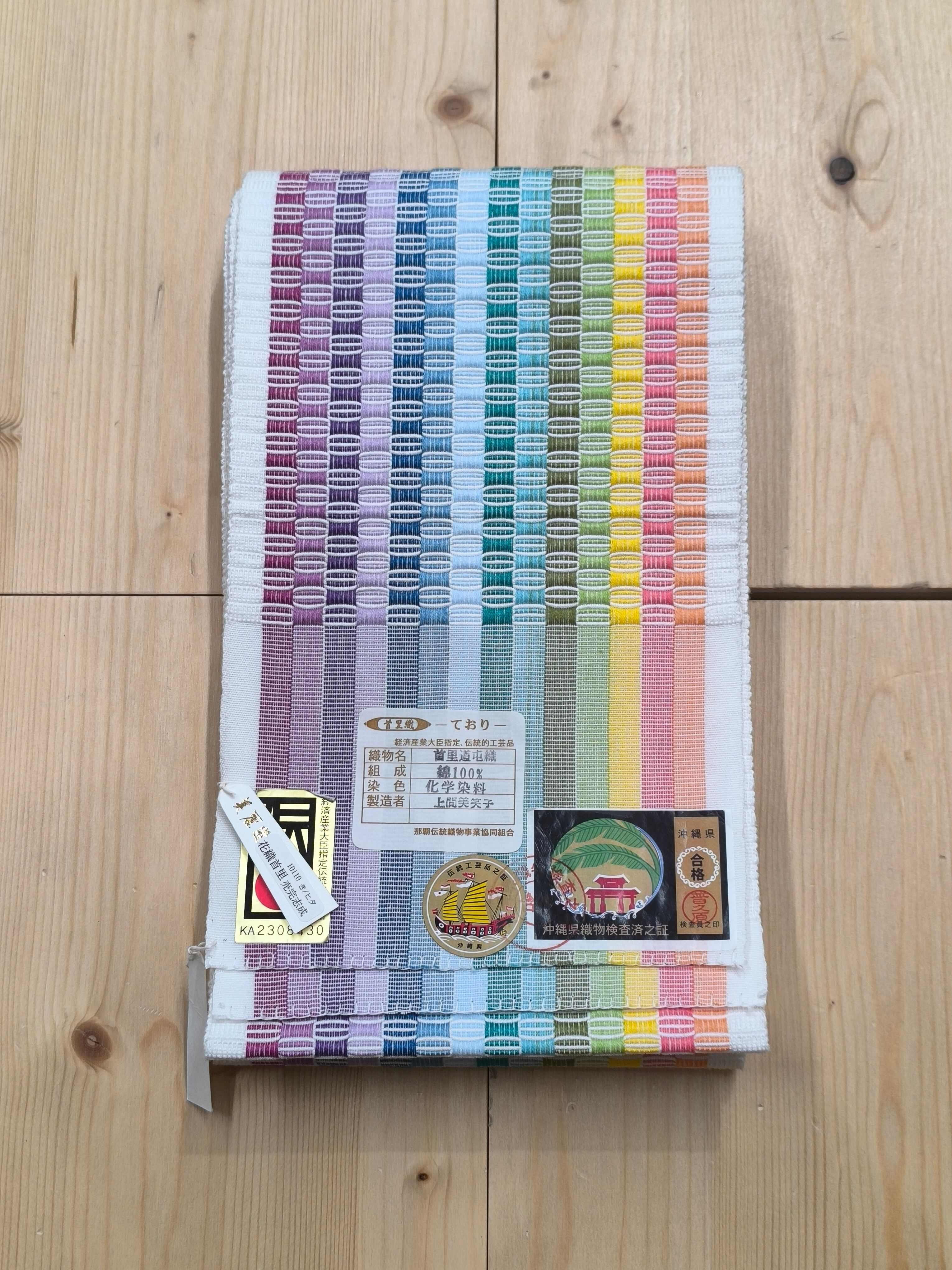 特徴的なざっくりとした手触り、太い木綿の緯糸をしっかりと打ち込んだ美しい首里ロートンの半幅帯。