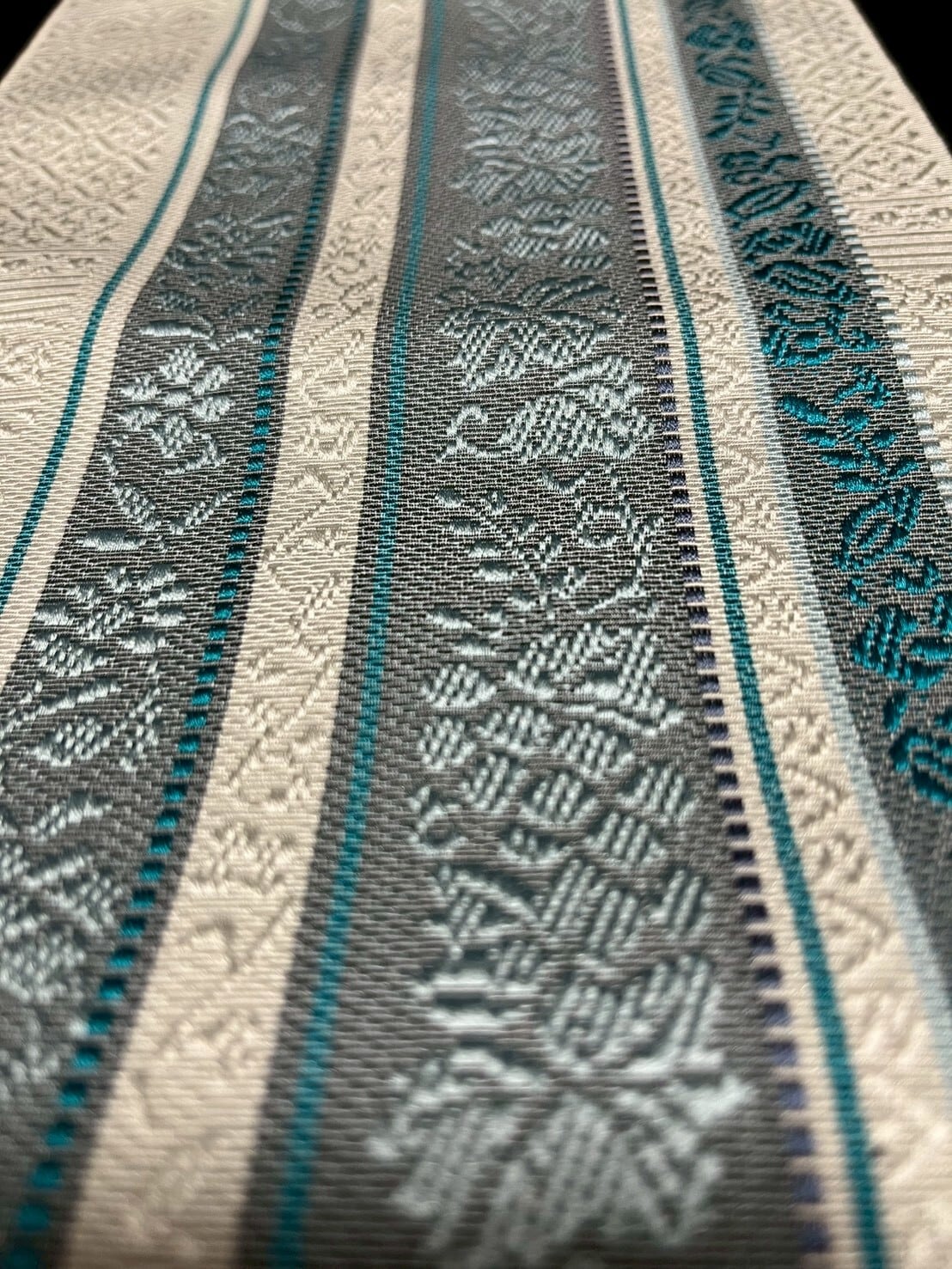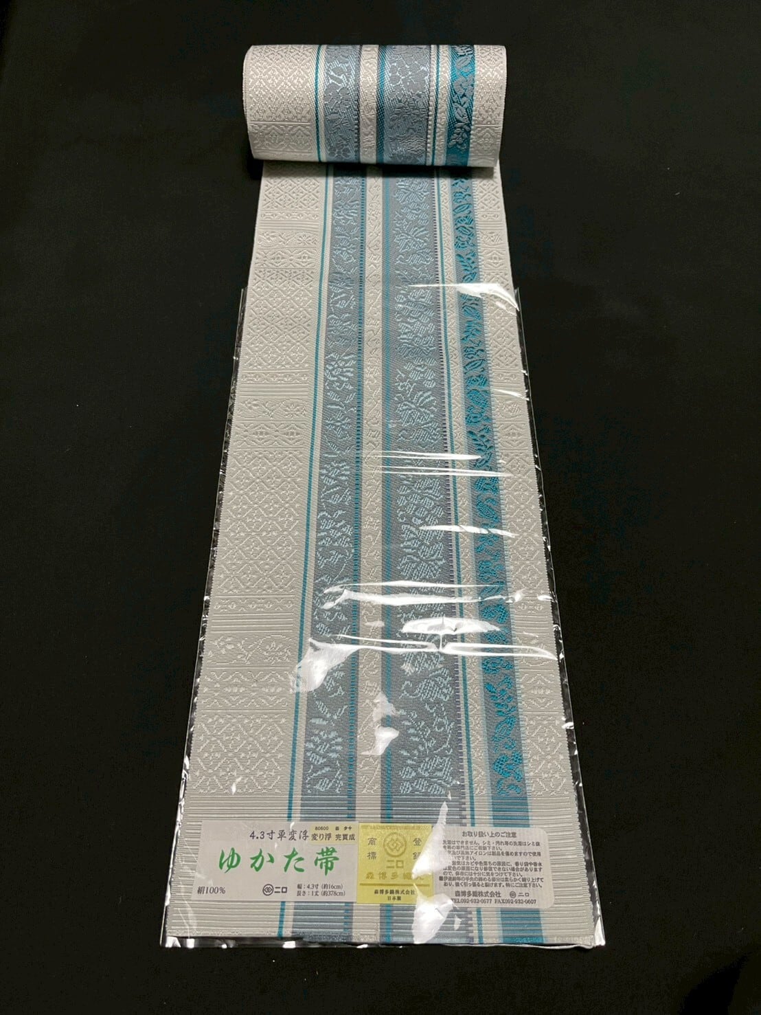 博多帯 半巾 森博多 4.3寸単変浮 ゆかた帯 白×ターコイズ 縞