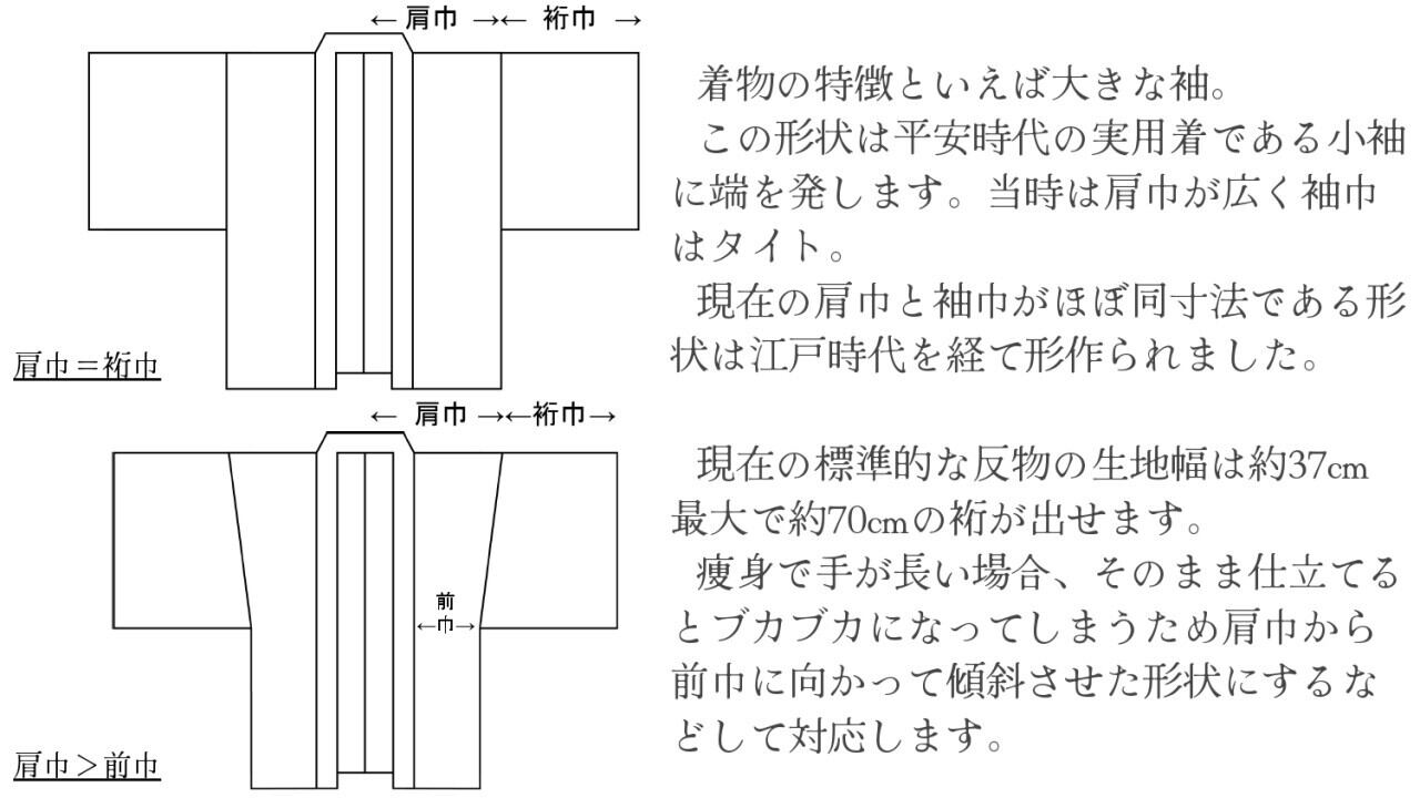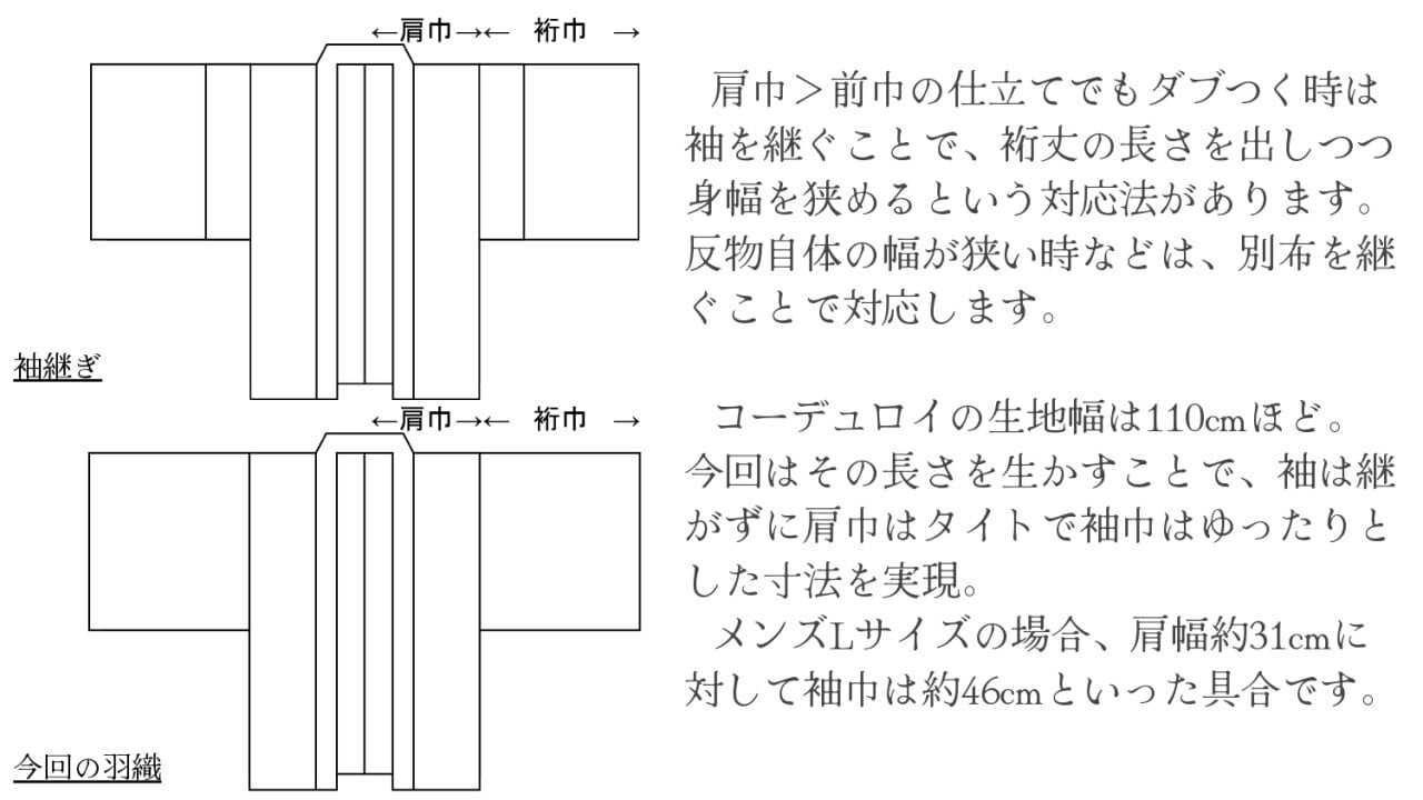 そして、洋服生地の生地幅広さを活かして、身幅や肩幅はタイトめに、裄丈はたっぷりとした独自寸法を採用。お譲り品やリユース着物の裄丈の短さを隠しつつ、ぶかぶかになりづらい寸法を目指しました。