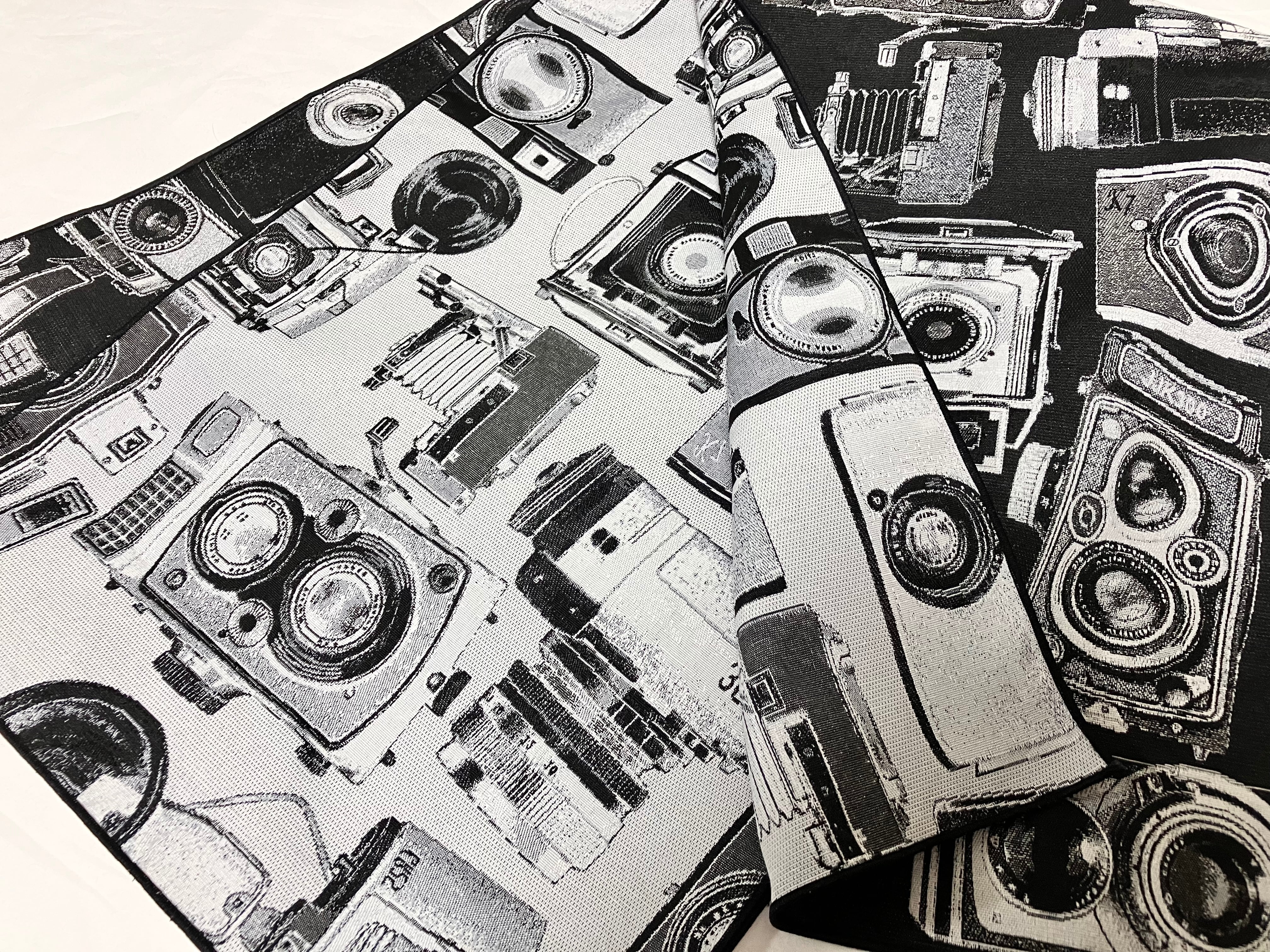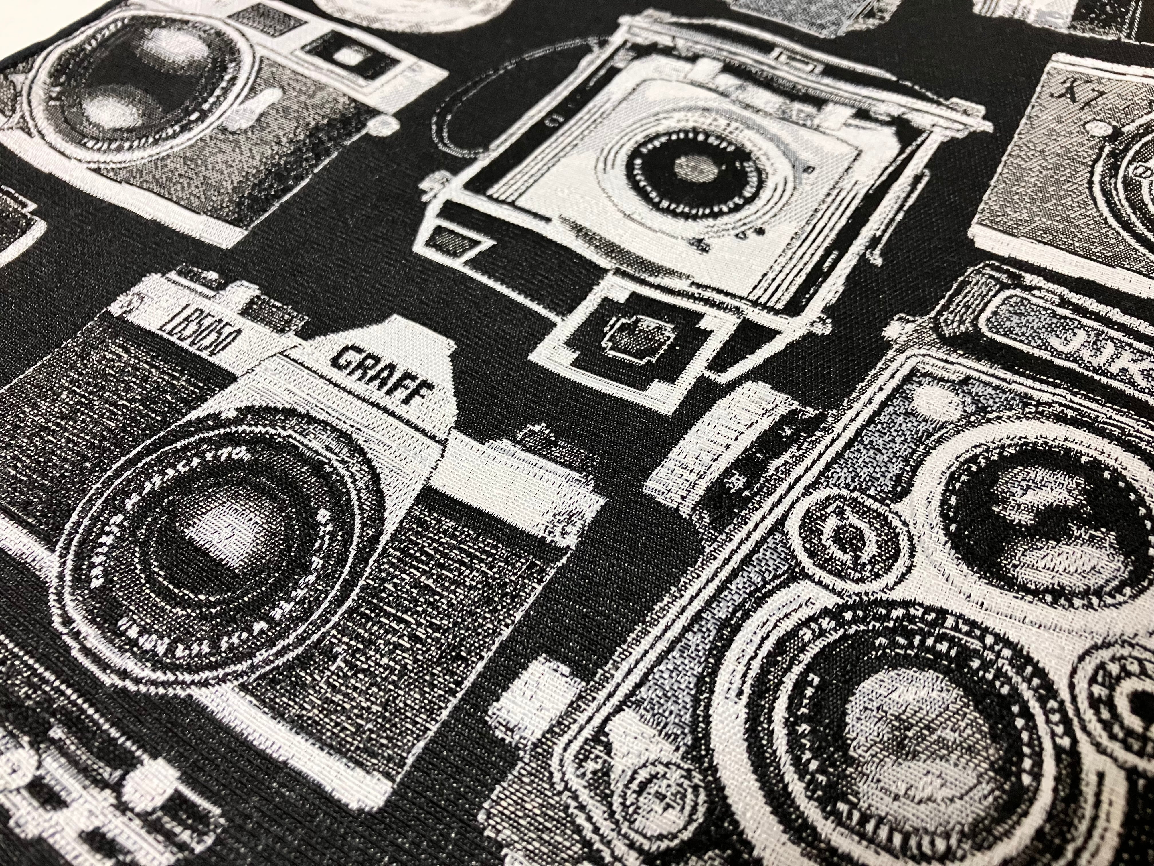白地に黒の濃淡で、様々なクラシックカメラの柄を重ね織りした生地です。