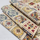 クリーム色ベースに様々な色で「マジョリカタイル」風の柄を織り上げたゴブラン織生地を使用した、オリジナル八寸名古屋帯。かがり名古屋の容量でロックミシンのウーリーロック仕上げ。