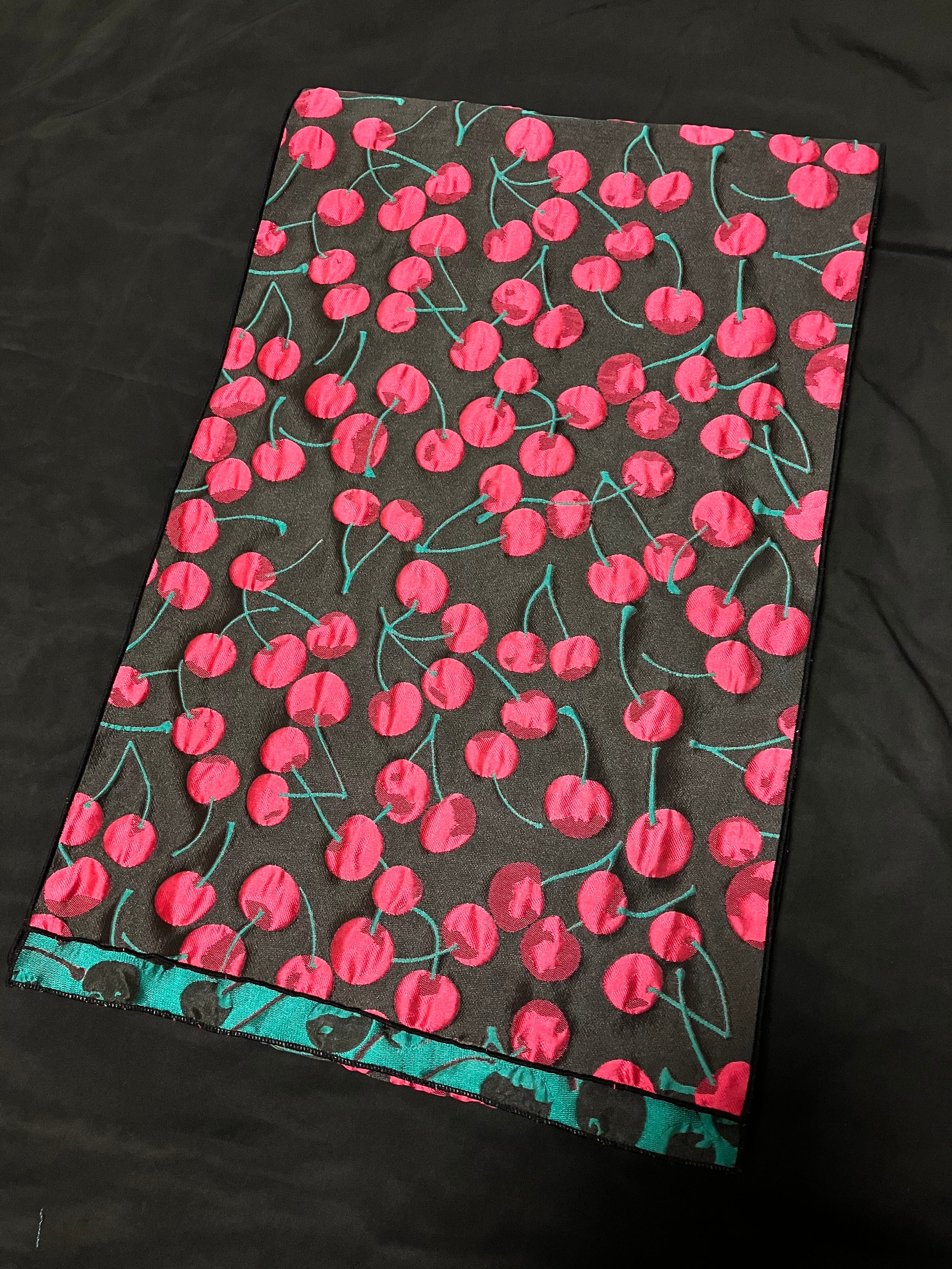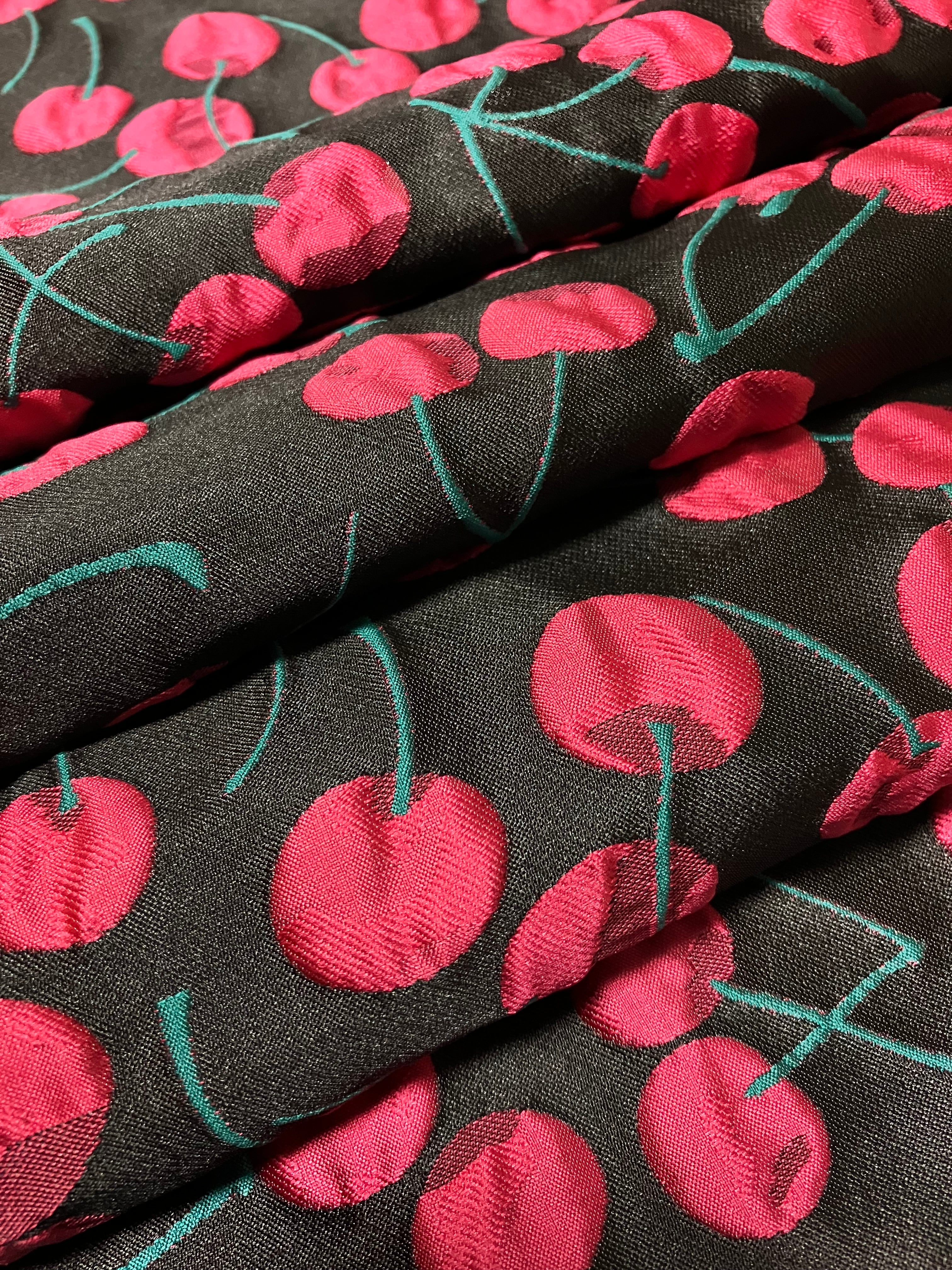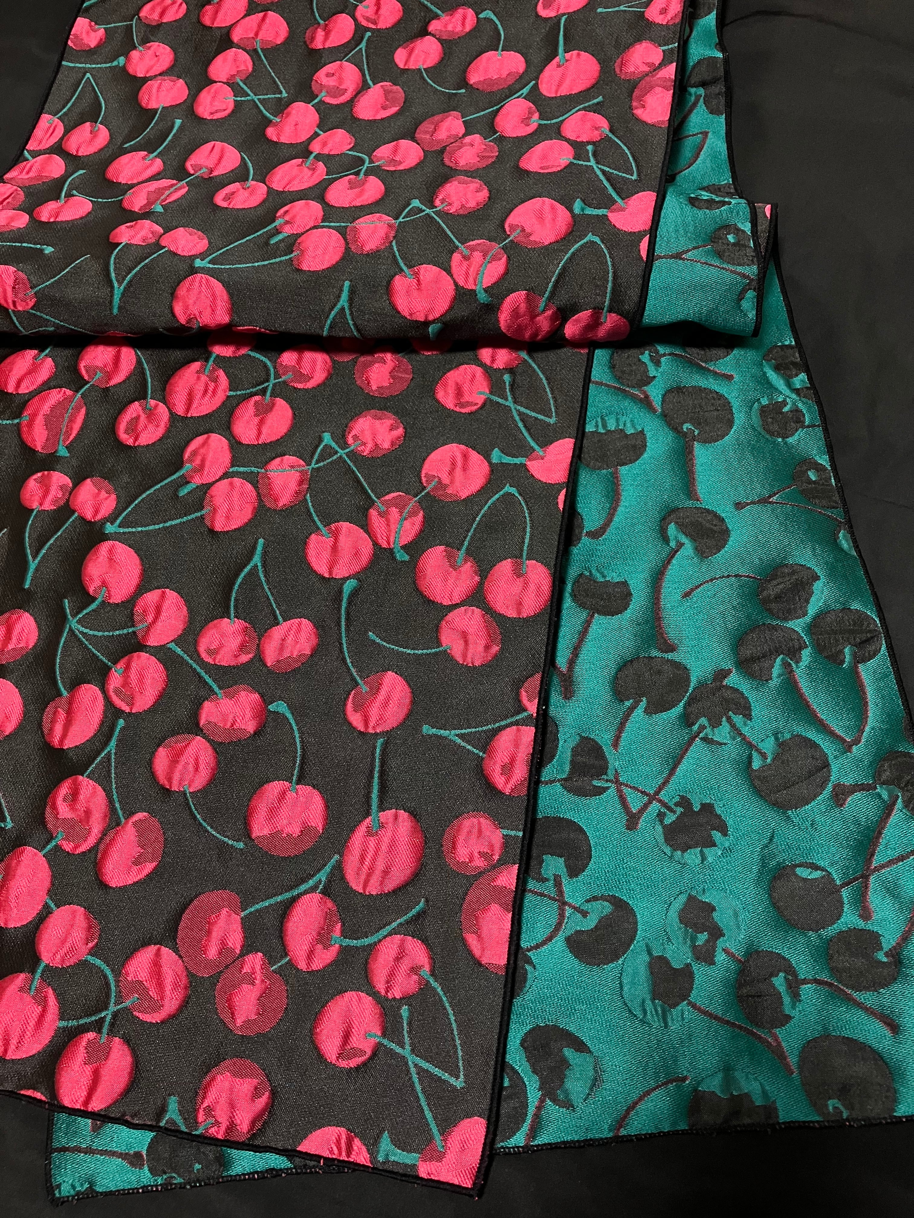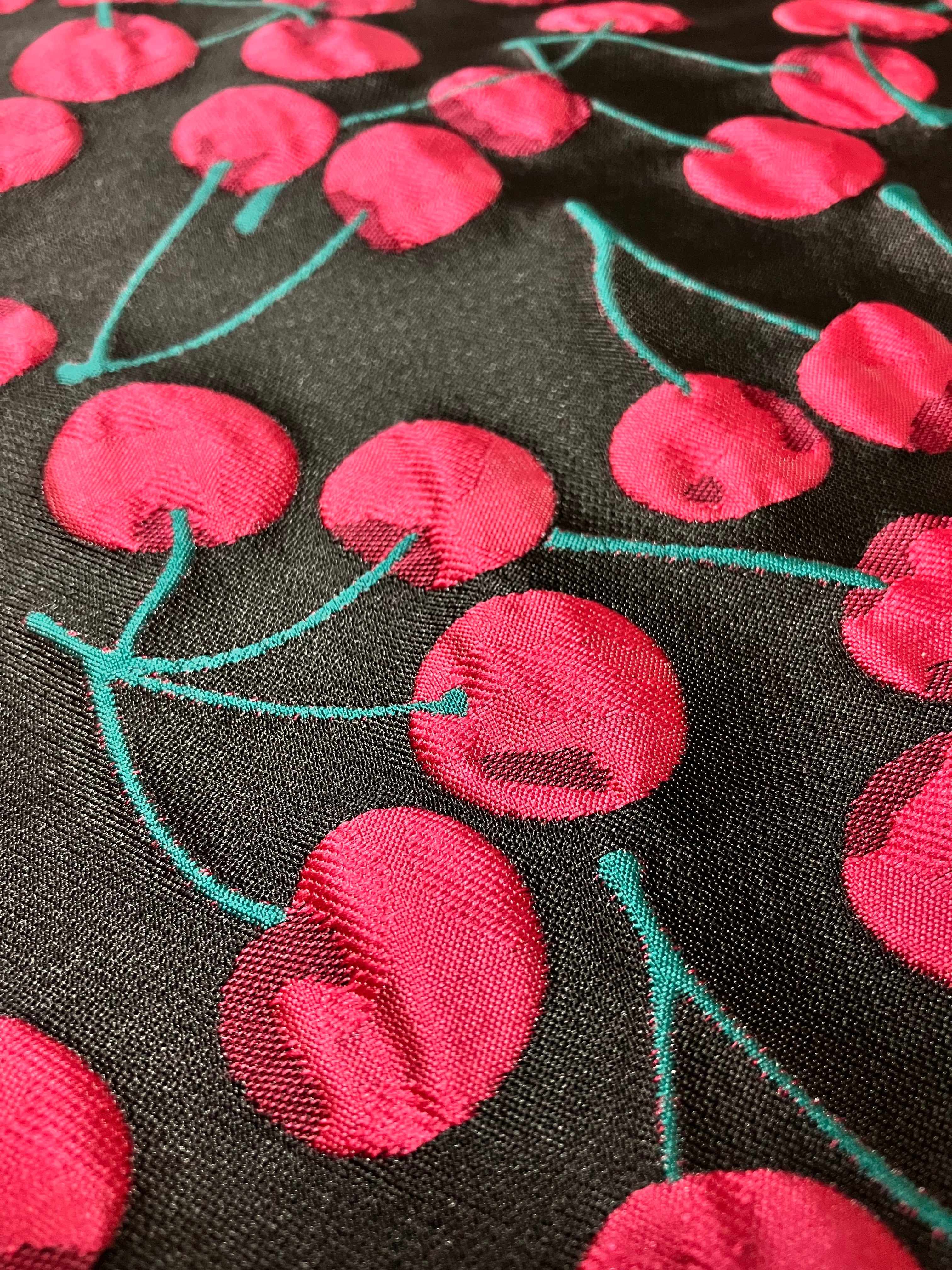 生地はふくれジャガード。黒の地に鮮やかな赤い実や緑の茎。ダブルジャガードため、裏面は緑が地となっています。