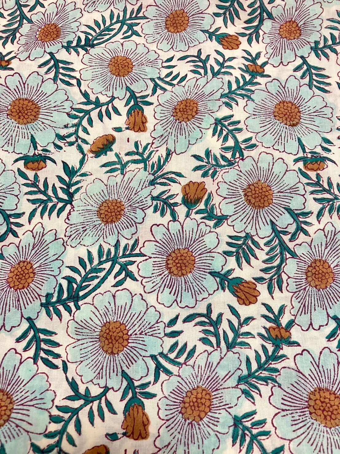 ほっこりとした花柄は、インドの伝統的な「ブロックプリント」によって染められています。手作業ならではの大らかな柄付けが味わいです。